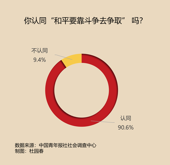 調(diào)查中,有90.6%的受訪者認(rèn)同“和平要靠斗爭(zhēng)去爭(zhēng)取”這句話。