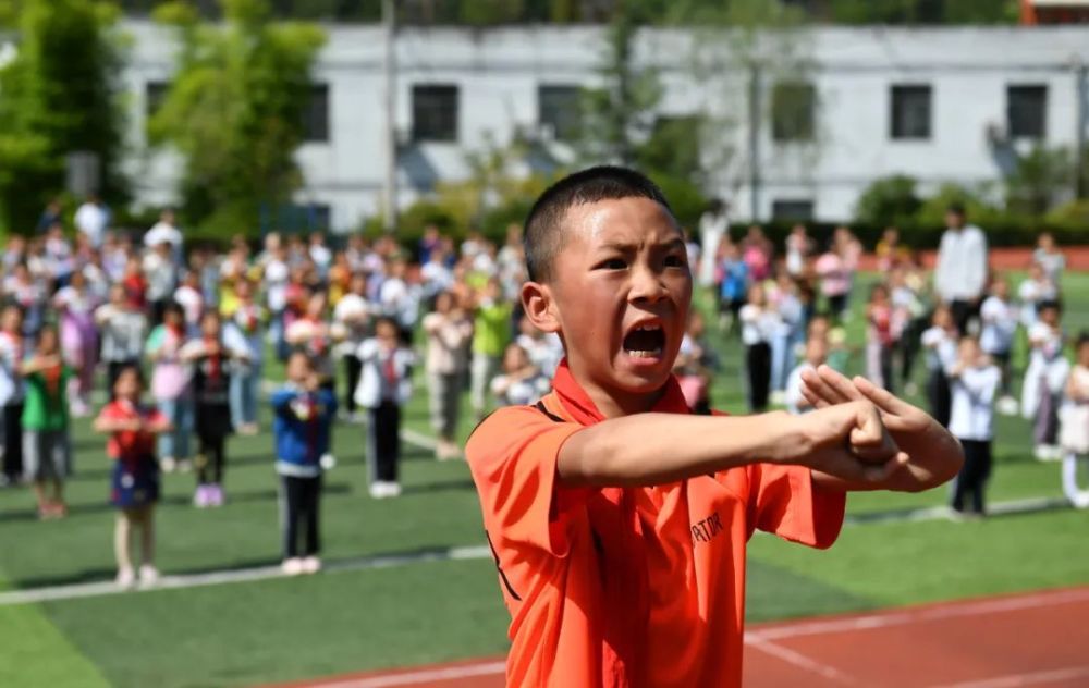 9月8日,在陜西平利老縣鎮(zhèn)中心小學(xué)的操場上,學(xué)生沈首洋(前)在大課間武術(shù)操上領(lǐng)操。新華社記者 李一博 攝
