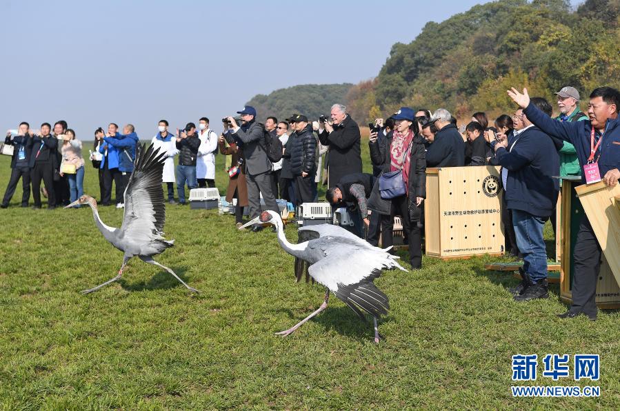 2019年12月8日,國內多家野生動物保護機構在江西鄱陽湖國家級自然保護區(qū)將120只被救治的珍稀候鳥成功放飛。這是工作人員放飛兩只白枕鶴。新華社記者 萬象 攝