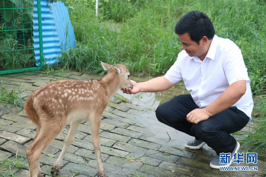 東洞庭湖麋鹿保護協(xié)會會長李政與小麋鹿“果果”互動(7月8日攝)。新華社記者 蔡瀟瀟 攝