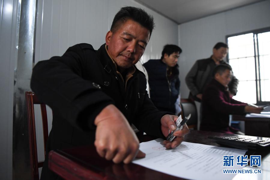 在湖南常德漢壽縣蔣家嘴鎮(zhèn),一名過去在洞庭湖捕魚的漁民在漢壽縣捕撈漁民退捕協(xié)議書上按下手印(2019年12月17日攝)。新華社記者 薛宇舸 攝