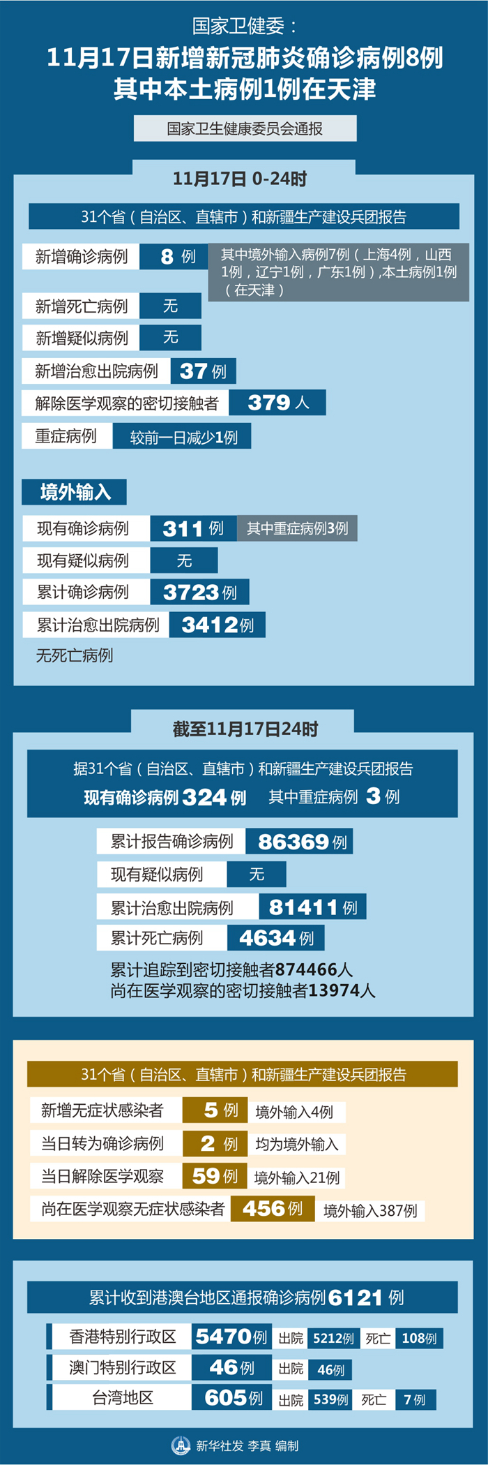 截至11月17日24時,據31個省(自治區(qū)、直轄市)和新疆生產建設兵團報告,現(xiàn)有確診病例324例(其中重癥病例3例),累計治愈出院病例81411例,累計死亡病例4634例,累計報告確診病例86369例,無現(xiàn)有疑似病例。累計追蹤到密切接觸者874466人,尚在醫(yī)學觀察的密切接觸者13974人。