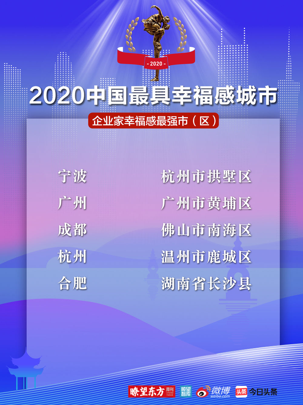 江蘇省太倉市、浙江省慈溪市、湖南省長沙縣、江蘇省張家港市、浙江省余姚市、浙江省瑞安市、河南省鞏義市、江蘇省邳州市、江蘇省昆山市、山東省肥城市十座城市被推選為“2020中國最具幸福感城市”(縣級(jí)市)。