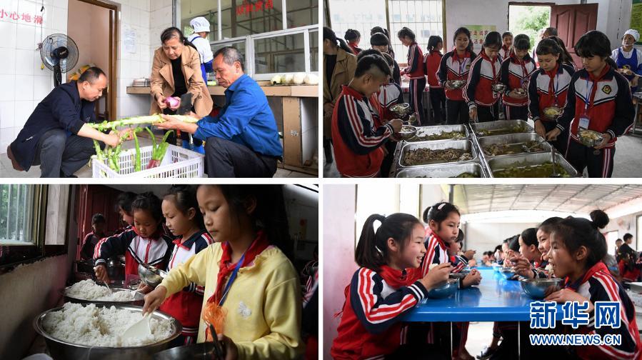 這是一張拼版照片。上左:在融水苗族自治縣東陽(yáng)村小學(xué),廚房師傅們?cè)跍?zhǔn)備營(yíng)養(yǎng)午餐;上右:東陽(yáng)村小學(xué)學(xué)生根據(jù)需要挑選菜肴。下左:東陽(yáng)村小學(xué)學(xué)生排隊(duì)打飯;下右:東陽(yáng)村小學(xué)學(xué)生在食用營(yíng)養(yǎng)午餐。近年來(lái),廣西在貧困地區(qū)大力推行學(xué)生營(yíng)養(yǎng)餐,幫助貧困學(xué)生健康成長(zhǎng)(2019年5月6日攝)。新華社記者 張愛林 攝