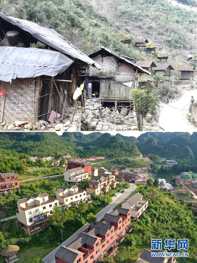這是一張拼版照片。上圖:整屯搬遷前的廣西南丹縣里湖瑤族鄉(xiāng)董甲村么干屯(2018年1月10日攝)。這里的村民都搬遷到“千家瑤寨·萬(wàn)戶瑤鄉(xiāng)”里湖王尚易地扶貧搬遷安置點(diǎn)。下圖:“千家瑤寨·萬(wàn)戶瑤鄉(xiāng)”里湖王尚易地扶貧搬遷安置點(diǎn)(8月4日攝,無(wú)人機(jī)照片)。新華社記者 周華 攝