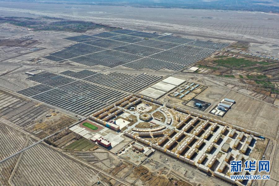 這是新疆阿克陶縣易地扶貧搬遷點(diǎn)的阿克陶縣現(xiàn)代設(shè)施農(nóng)業(yè)產(chǎn)業(yè)扶貧基地和阿克陶縣昆侖佳苑小區(qū)(3月22日攝,無(wú)人機(jī)照片)。新華社記者 丁磊 攝