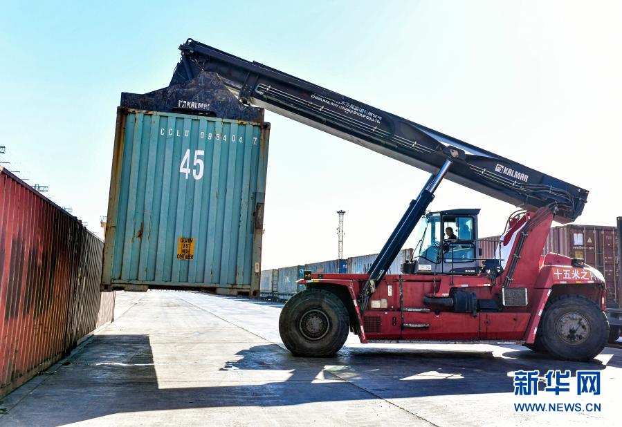 工人在中歐班列烏魯木齊集結(jié)中心吊運(yùn)貨物(3月12日攝)。新華社記者 王菲 攝