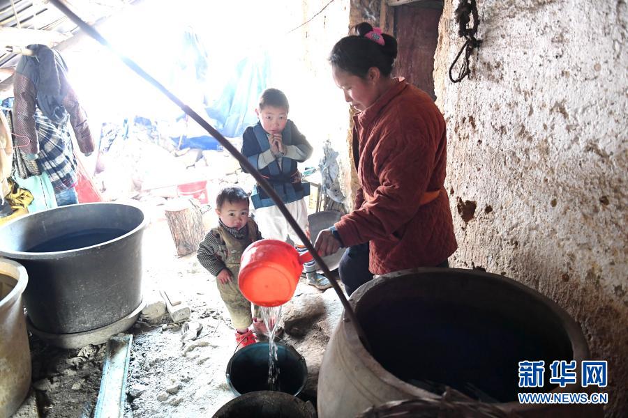 在廣西南丹縣里湖瑤族鄉(xiāng),一個村民從水缸里舀水(2018年2月5日攝)。新華社記者 周華 攝