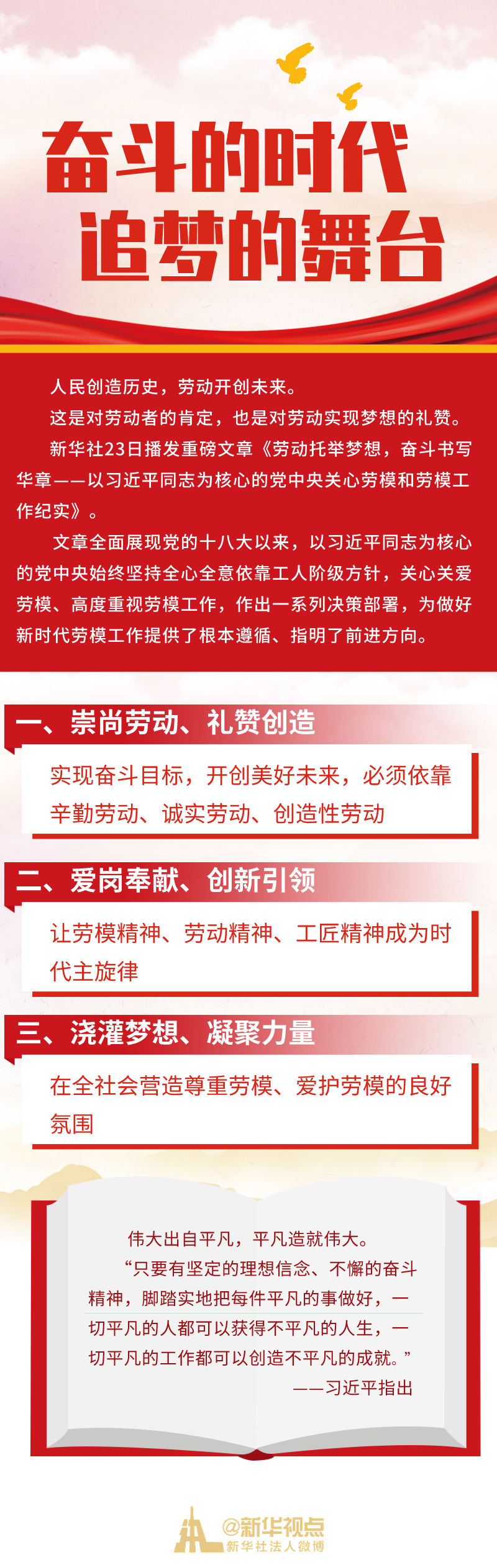 新華社23日播發(fā)重磅文章《勞動托舉夢想,奮斗書寫華章——以習近平同志為核心的黨中央關(guān)心勞模和勞模工作紀實》。