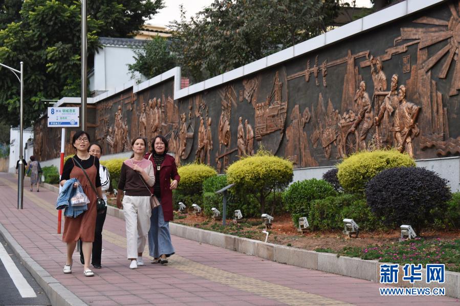 11月17日,行人在福建省三明市三鋼集團(tuán)生活區(qū)走過(guò)浮雕墻。新華社記者 姜克紅 攝
