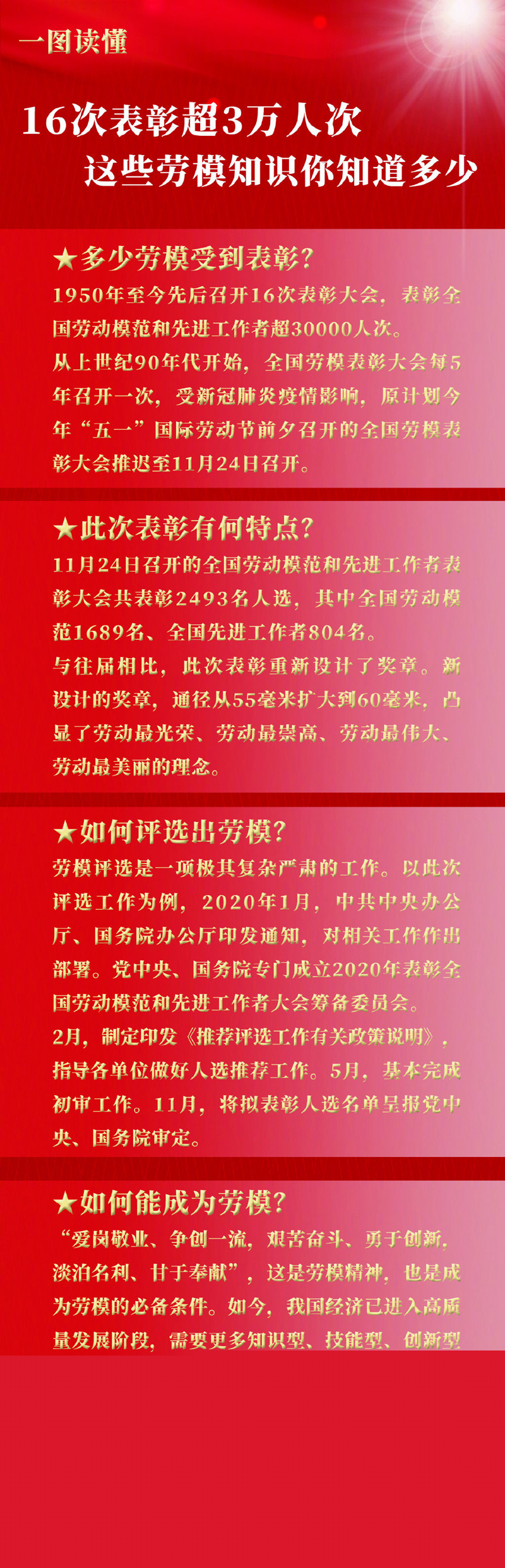24日,1689名全國(guó)勞動(dòng)模范和804名全國(guó)先進(jìn)工作者在人民大會(huì)堂受到表彰,代表全體勞動(dòng)者接受黨和國(guó)家的最高禮贊。新中國(guó)成立以來表彰了多少勞模?勞模是怎樣評(píng)選出來的?如何才能成為勞模?戳圖了解↓ ?????