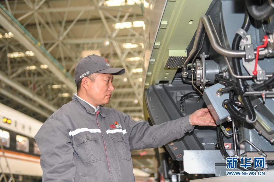 11月25日,在中車長(zhǎng)春軌道客車股份有限公司高速動(dòng)車組制造中心調(diào)試車間,羅昭強(qiáng)檢查復(fù)興號(hào)高鐵列車的電氣系統(tǒng)。新華社記者 張楠 攝