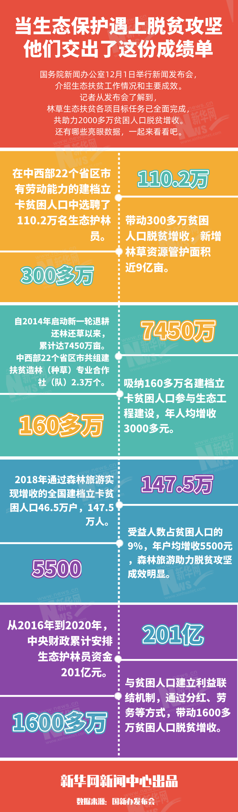 ??? 國務(wù)院新聞辦公室12月1日舉行新聞發(fā)布會,介紹生態(tài)扶貧工作情況和主要成效。記者從發(fā)布會了解到,林草生態(tài)扶貧各項目標(biāo)任務(wù)已全面完成,共助力2000多萬貧困人口脫貧增收。還有哪些亮眼數(shù)據(jù),一起來看看吧。