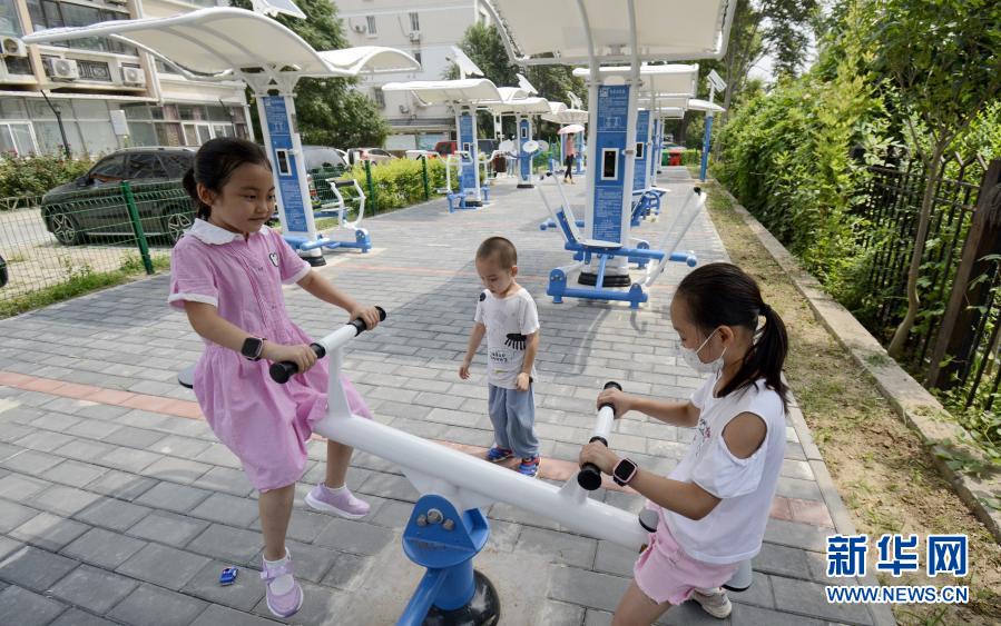孩子們在回龍觀龍澤苑社區(qū)內(nèi)的健身廣場玩耍(8月11日攝)。新華社記者 李欣 攝
