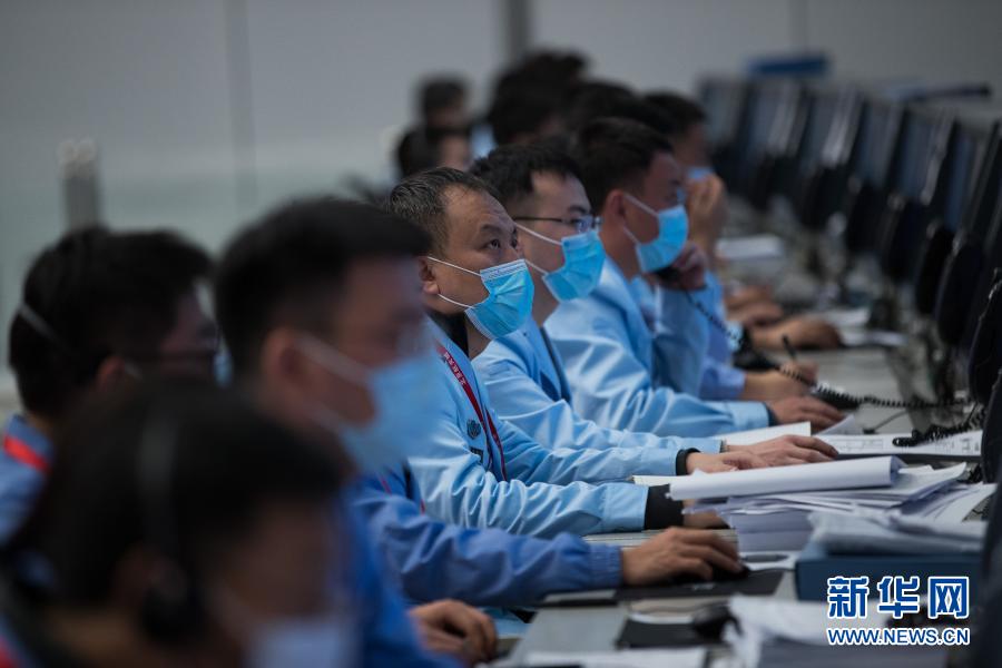 12月6日,航天科技人員在北京航天飛行控制中心指揮大廳監(jiān)測(cè)嫦娥五號(hào)上升器與軌道器返回器組合體交會(huì)對(duì)接情況。新華社記者 金立旺攝