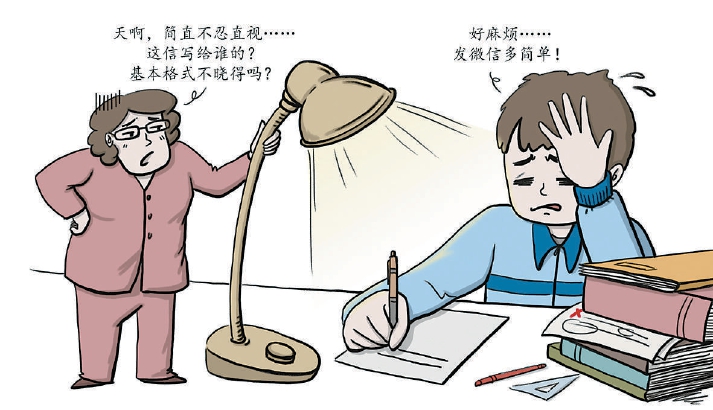齊齊從小學一年級就開始練習毛筆字,如今已經(jīng)能寫出很不錯的行書,但他也從不寫信,“有必要嗎?”齊齊說,父母要求他每個月要給遠在老家的祖父母、外祖父母打電話,每次電話的通話時間也就兩三分鐘,“我爸他們也就是問奶奶吃飯了沒,多買點吃的,不舒服趕緊去醫(yī)院……就這幾句話,真沒營養(yǎng)?!?/p>