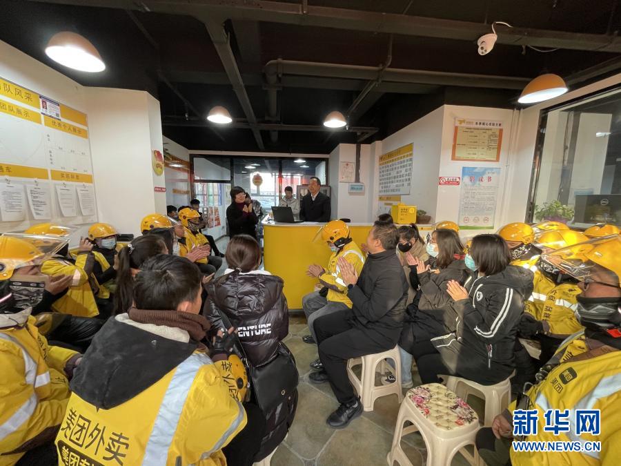 在寧夏回族自治區(qū)吳忠市同心縣,“啟夢(mèng)筑夢(mèng)”青年講師團(tuán)講師楊克斌為30多名外賣配送員開(kāi)展“微宣講”(12月8日攝)。新華社記者 馬麗娟 攝