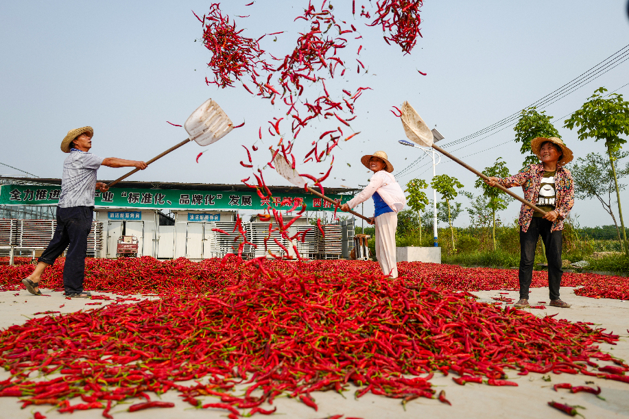 ??????2020年拍攝于陜西興平桑鎮(zhèn)西橋村金鵬辣蒜專(zhuān)業(yè)合作社,農(nóng)民將辣椒揚(yáng)起晾曬。(組照4)張綺云 攝