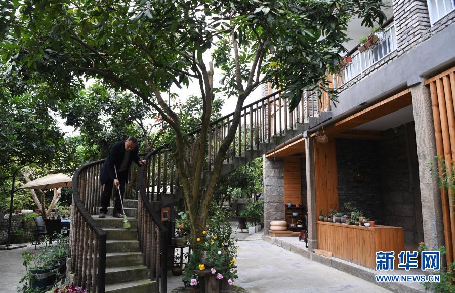 重慶市萬州區(qū)大周鎮(zhèn)五土村一民宿工作人員在院子里打掃衛(wèi)生(12月10日攝)。新華社記者 王全超 攝