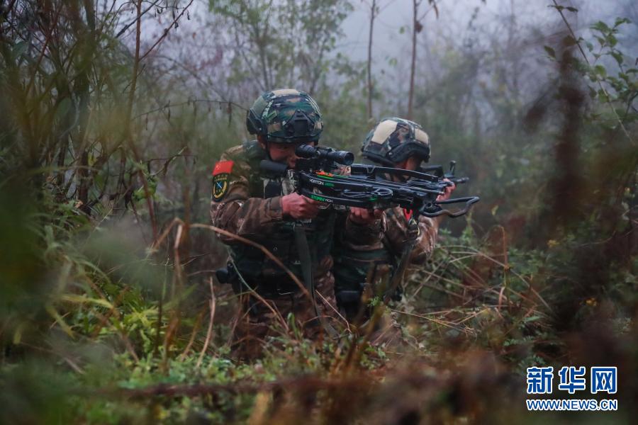 武警貴州總隊(duì)六盤(pán)水支隊(duì)特戰(zhàn)隊(duì)員在山林地捕殲戰(zhàn)斗中用弓弩射擊(12月10日攝)。新華社發(fā)(康夫?qū)?攝)
