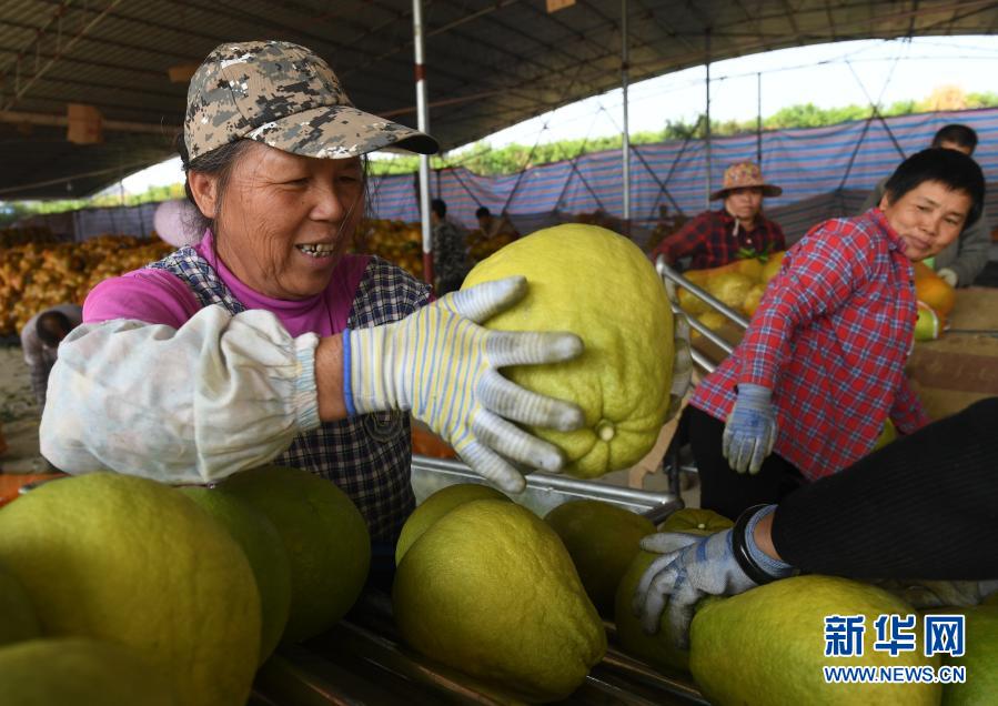 在廣西羅城仫佬族自治縣金玉柚生態(tài)產(chǎn)業(yè)扶貧示范區(qū),村民在分揀柚子準(zhǔn)備裝車外銷(2019年11月5日攝)。新華社記者 陸波岸 攝