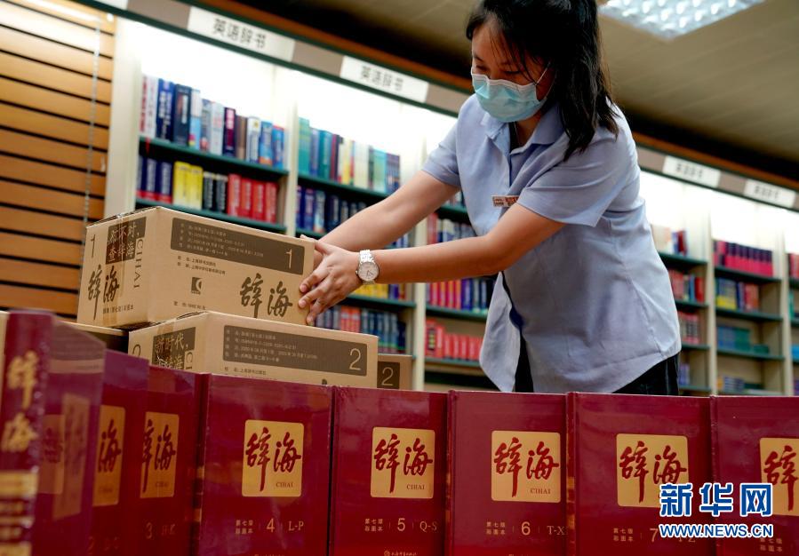 上海書城工作人員將《辭?!罚ǖ谄甙妫[放上架(9月10日攝)。新華社記者 劉穎 攝