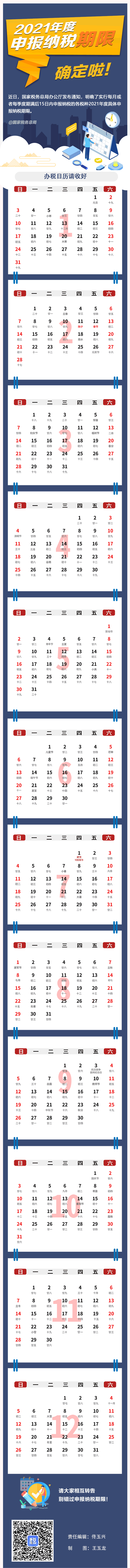 近日,國家稅務(wù)總局辦公廳發(fā)布《關(guān)于明確2021年度申報(bào)納稅期限的通知》(稅總辦函〔2020〕242號(hào)),明確實(shí)行每月或者每季度期滿后15日內(nèi)申報(bào)納稅的各稅種2021年度具體申報(bào)納稅期限。為了方便納稅人每月查找辦稅日期,一張動(dòng)圖送給你!快收藏起來吧~