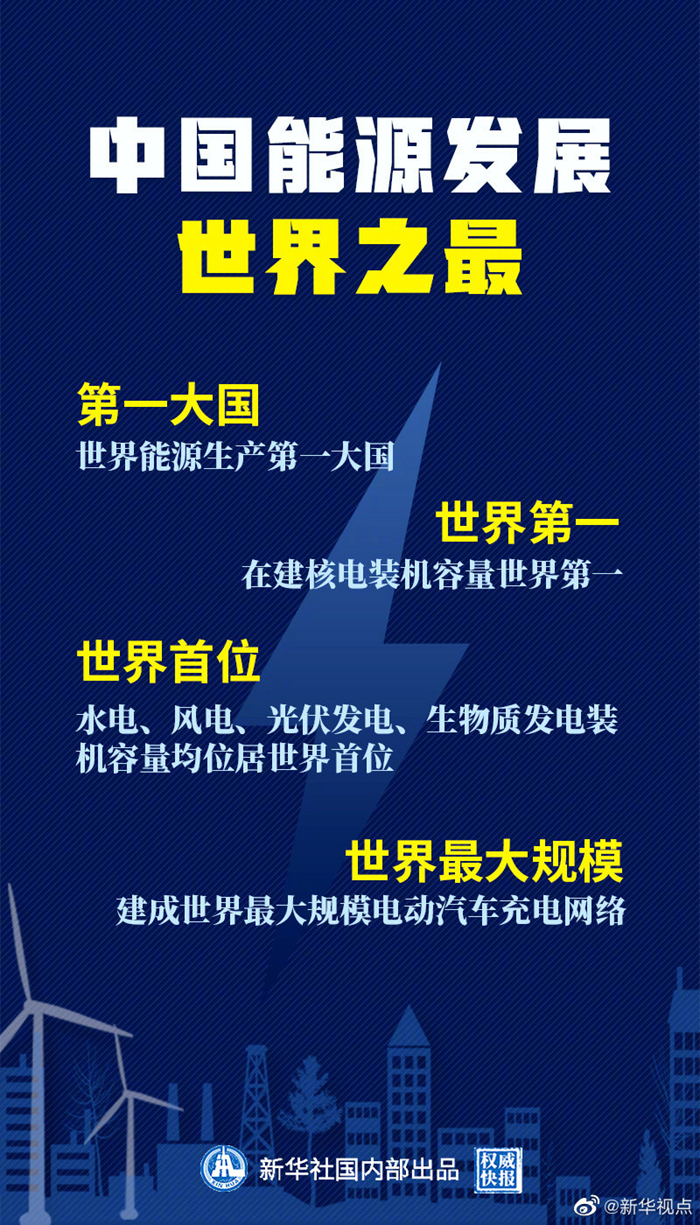 根據(jù)國務院新聞辦公室21日發(fā)布的《新時代的中國能源發(fā)展》白皮書,中國能源發(fā)展有多個世界之最:初步核算,2019年中國一次能源生產(chǎn)總量達39.7億噸標準煤,為世界能源生產(chǎn)第一大國;截至2019年底,在運在建核電裝機容量6593萬千瓦,居世界第二,在建核電裝機容量世界第一;截至2019年底,水電、風電、光伏發(fā)電、生物質(zhì)發(fā)電裝機容量分別達3.56億千瓦、2.1億千瓦、2.04億千瓦、2369萬千瓦,均位居世界首位;截至2019年底,全國電動汽車充電基礎設施達120萬處,建成世界最大規(guī)模充電網(wǎng)絡。(記者:劉羊旸 海報設計:張晨光)