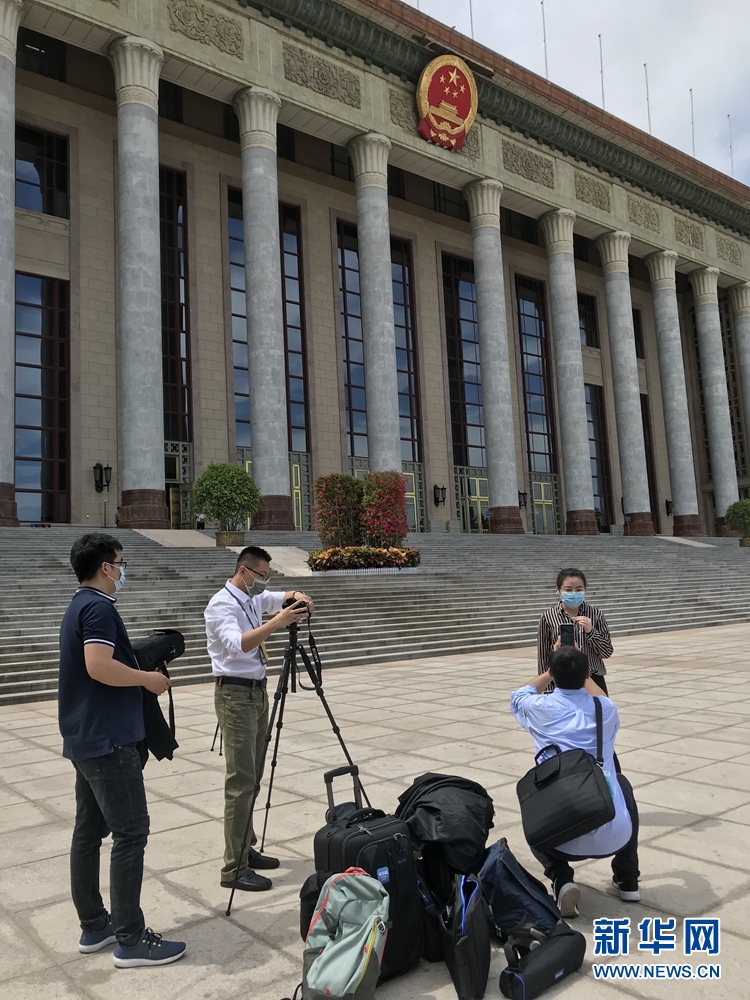5月20日,全國政協(xié)十三屆三次會(huì)議召開新聞發(fā)布會(huì)。大會(huì)新聞發(fā)言人郭衛(wèi)民向中外媒體介紹本次大會(huì)有關(guān)情況并回答記者提問。圖為本網(wǎng)記者在人民大會(huì)堂東門外廣場(chǎng)做直播前準(zhǔn)備工作。新華網(wǎng)記者 周紅軍? 攝