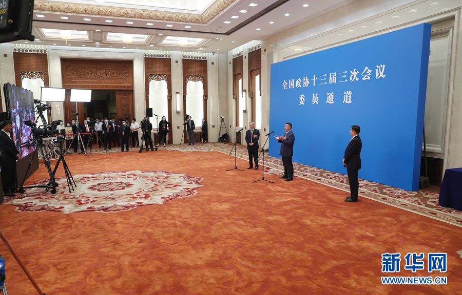 全國政協(xié)十三屆三次會議首場“委員通道”采訪活動于5月21日在人民大會堂新聞發(fā)布廳舉行,邀請部分全國政協(xié)委員通過網(wǎng)絡(luò)視頻方式接受媒體采訪。圖為“委員通道”現(xiàn)場。新華網(wǎng) 王翰林 攝