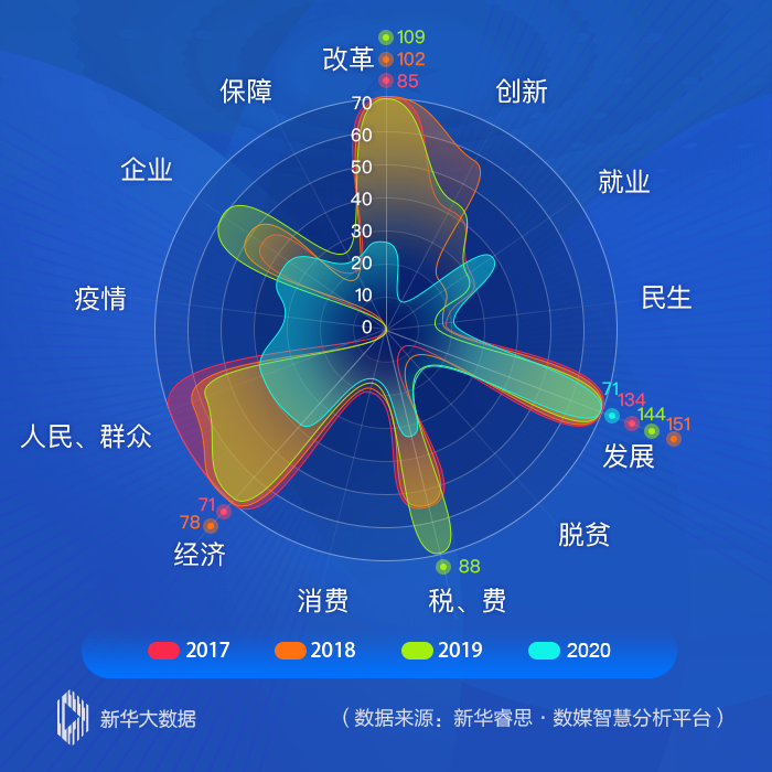 政府工作報告出爐,字斟句酌有多用心?新華睿思對2017年至2020年四年的政府工作報告進(jìn)行了文本語義分析。四年來,政府工作報告圍繞“發(fā)展”“改革”“經(jīng)濟(jì)”進(jìn)行了全面的闡述和工作部署,回應(yīng)群眾關(guān)切,堅持把人民群眾的利益放在第一位。
