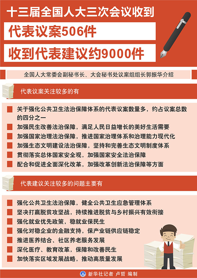 新華社北京5月26日電 記者26日從十三屆全國人大三次會議秘書處獲悉,到大會主席團決定的代表提出議案截止時間5月25日12時,大會秘書處共收到代表提出的議案506件。同時,收到代表建議約9000件。