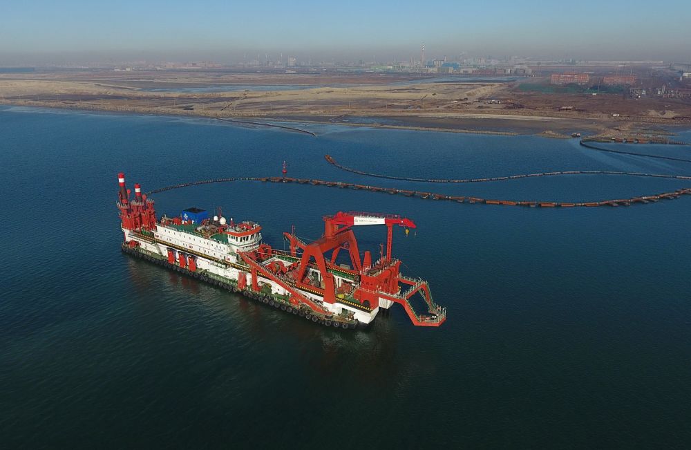 3月14日,一艘施工船在唐山港京唐港區(qū)25萬噸級(jí)航道工程海域施工作業(yè)(無人機(jī)拍攝)。新華社記者楊世堯攝