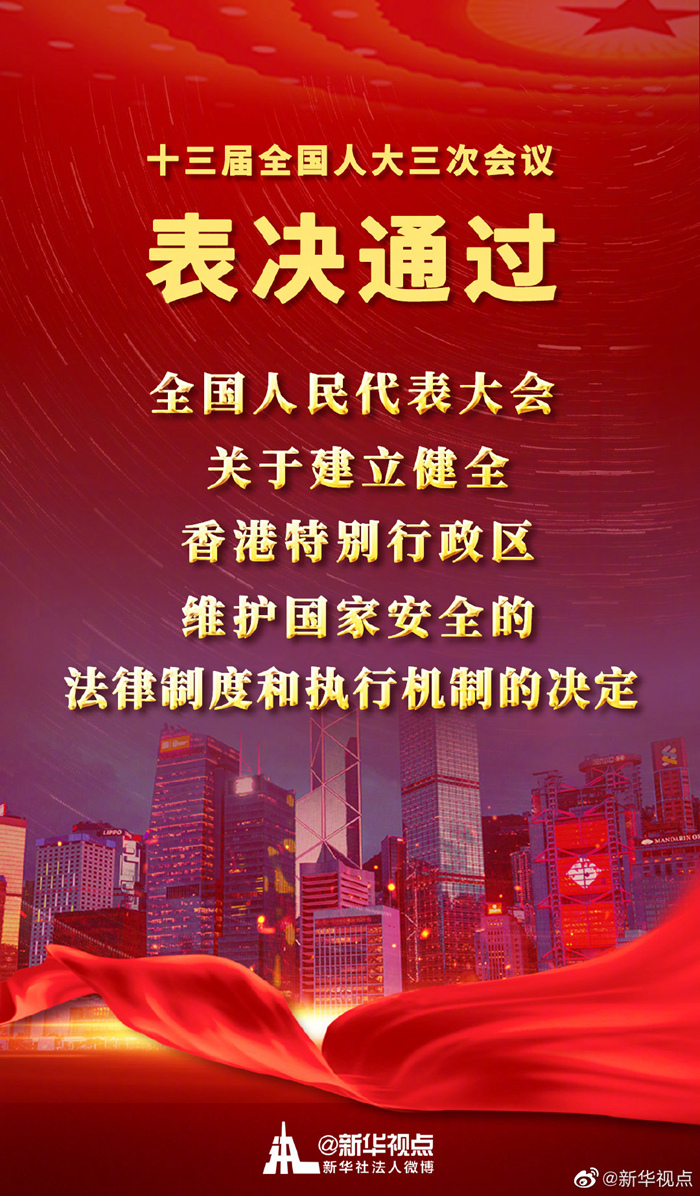 新華社北京5月28日電? 5月28日下午,十三屆全國(guó)人大三次會(huì)議以高票表決通過《全國(guó)人民代表大會(huì)關(guān)于建立健全香港特別行政區(qū)維護(hù)國(guó)家安全的法律制度和執(zhí)行機(jī)制的決定》。