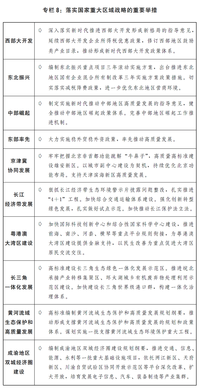 一是落實落細重大區(qū)域發(fā)展戰(zhàn)略。落實區(qū)域協(xié)調(diào)發(fā)展新機制,持續(xù)推進西部大開發(fā)形成新格局,支持東北地區(qū)全面振興全方位振興,健全中部地區(qū)崛起政策體系和工作機制,繼續(xù)推動東部地區(qū)率先發(fā)展。縱深推進京津冀協(xié)同發(fā)展,加快實施雄安新區(qū)重點建設(shè)項目,完善北京非首都功能疏解政策體系。大力推進長江經(jīng)濟帶生態(tài)環(huán)境突出問題整改和系統(tǒng)性保護修復,加快構(gòu)建綜合交通運輸體系,促進內(nèi)河船舶改造。推動粵港澳大灣區(qū)基礎(chǔ)設(shè)施互聯(lián)互通,有序開展國際科技創(chuàng)新中心建設(shè),加快橫琴、河套等重大合作平臺建設(shè)。高標準建設(shè)長三角生態(tài)綠色一體化示范區(qū),推動長三角交通一體化更高質(zhì)量發(fā)展,建設(shè)虹橋國際開放樞紐。抓緊做好黃河流域生態(tài)保護和高質(zhì)量發(fā)展規(guī)劃綱要編制和出臺實施工作。大力支持成渝地區(qū)雙城經(jīng)濟圈建設(shè),打造全國高質(zhì)量發(fā)展的重要增長極。積極推進西部陸海新通道建設(shè)。深化對口支援。支持少數(shù)民族和民族地區(qū)加快發(fā)展。推動國家級新區(qū)、開發(fā)區(qū)等功能平臺創(chuàng)新提升發(fā)展,加快推進資源型地區(qū)經(jīng)濟轉(zhuǎn)型和老工業(yè)城市更新改造。推動山西開展能源革命綜合改革試點。繼續(xù)推進承接產(chǎn)業(yè)轉(zhuǎn)移示范區(qū)建設(shè),在具備條件的內(nèi)陸城市打造一批高端制造業(yè)基地。制定發(fā)展海洋經(jīng)濟加快建設(shè)海洋強國的意見。完善主體功能區(qū)戰(zhàn)略和制度,編制《全國國土空間規(guī)劃綱要(2021-2035)》。