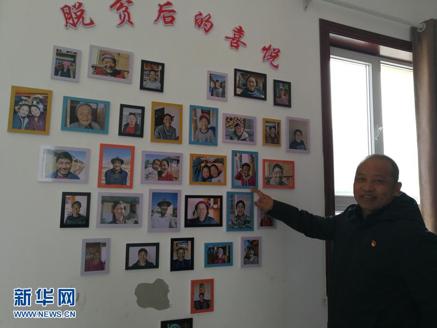 青海省黃南藏族自治州尖扎縣尖扎灘鄉(xiāng)來玉村扶貧第一書記李玉棟向記者介紹來玉村“脫貧后的喜悅”。照片墻集納了村民們脫貧后的笑臉照片(2020年12月11日攝)。新華社記者 顧玲 攝