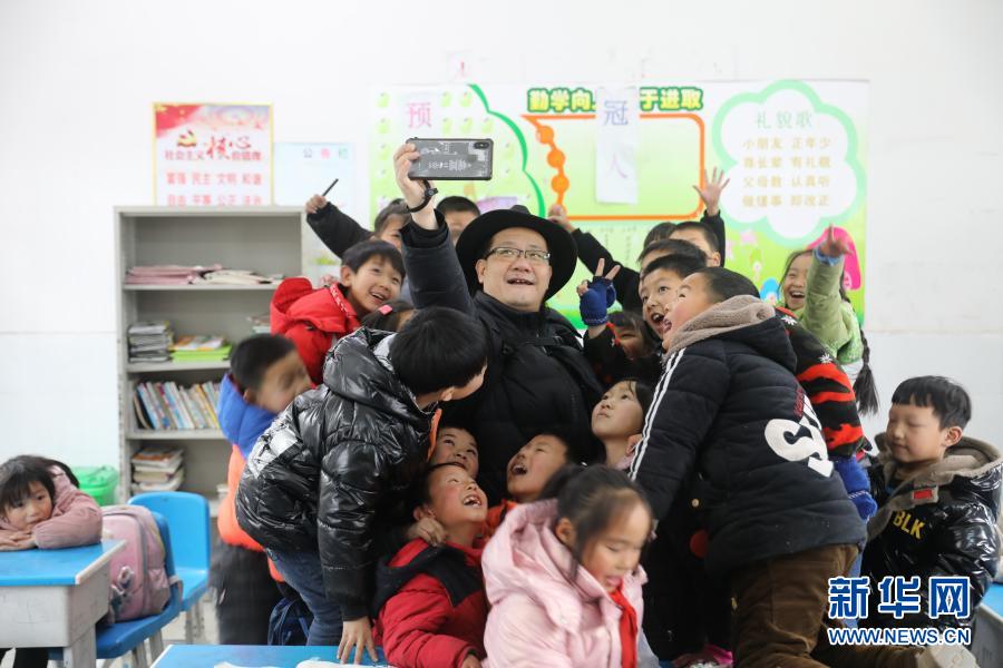 2020年12月17日,植國明在大灣小學和孩子們自拍。新華社記者 曹力攝