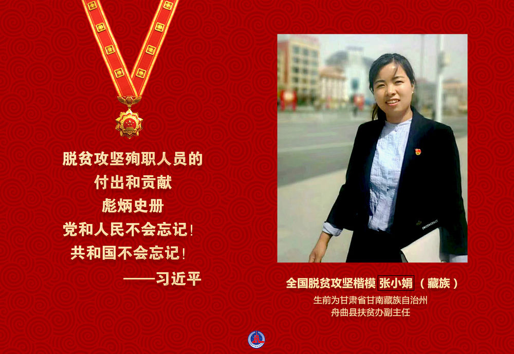張小娟同志是在習近平新時代中國特色社會主義思想指引下成長起來的優(yōu)秀共產(chǎn)黨員,是在脫貧攻堅一線不懈奮斗的優(yōu)秀青年干部。2019年10月7日,在舟曲縣貧困鄉(xiāng)鎮(zhèn)脫貧攻堅驗收結束返回縣城途中因交通事故不幸殉職,年僅34歲。