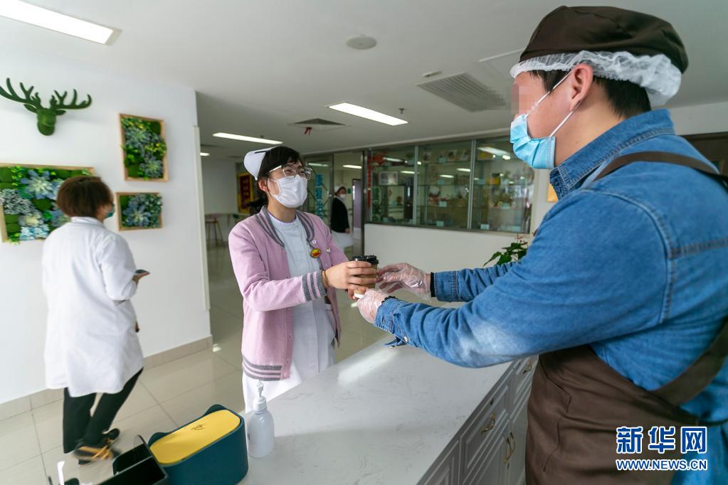 在上海市楊浦區(qū)精神衛(wèi)生中心開了一家名叫“Healing Coffee”的咖啡店,三名已出院的患者輪流擔(dān)任調(diào)制咖啡、收銀、結(jié)算的工作。咖啡店為衛(wèi)生中心的工作人員提供咖啡等飲品。這是見習(xí)咖啡師沐枝為醫(yī)護人員送上制作好的咖啡(2020年12月3日攝)。新華社記者 王翔 攝