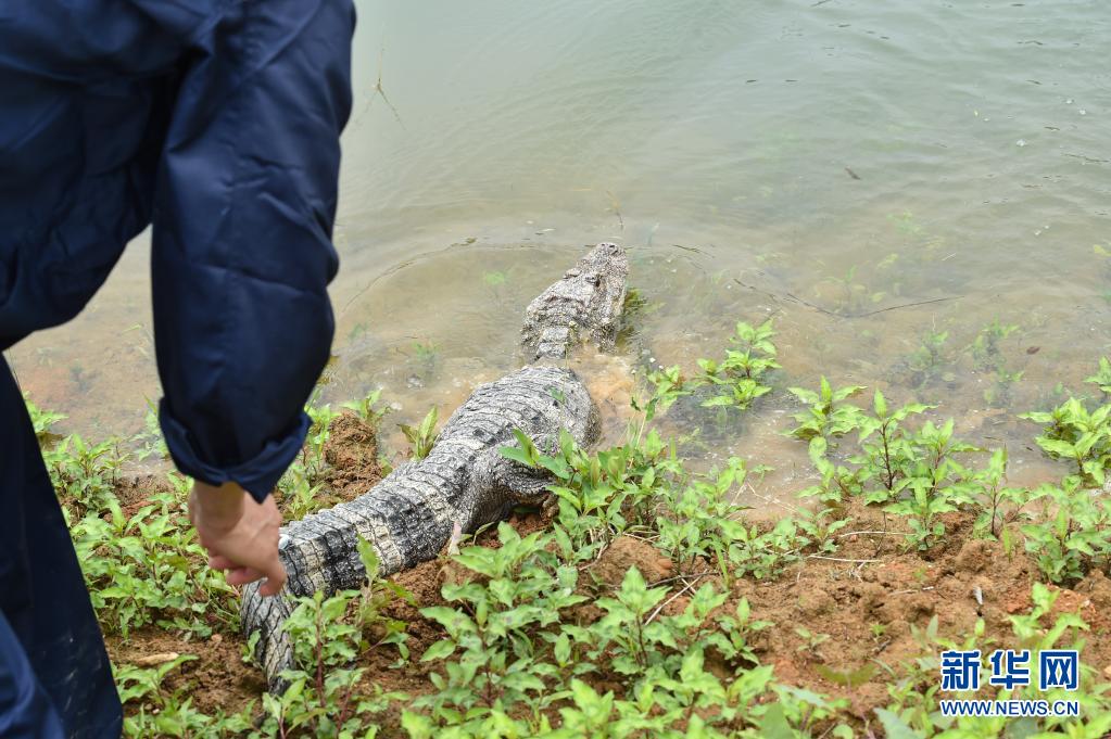 5月13日,工作人員放歸揚子鱷。當日,安徽揚子鱷國家級自然保護區(qū)在涇縣雙坑片區(qū)揚子鱷核心棲息地放歸51條人工繁育揚子鱷?!⌒氯A社記者 韓旭 攝