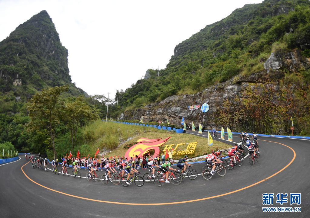 在2017環(huán)廣西公路自行車世界巡回賽中,參賽選手經(jīng)過(guò)馬山縣古零鎮(zhèn)古零村弄拉屯路段(2017年10月22日攝)。新華社記者 陸波岸 攝