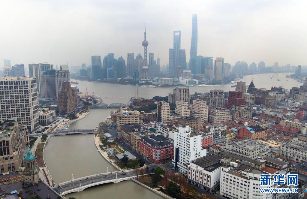 從空中俯瞰蘇州河(下)與黃浦江的交匯處(無(wú)人機(jī)照片,2020年12月29日攝)。新華社記者 方喆 攝