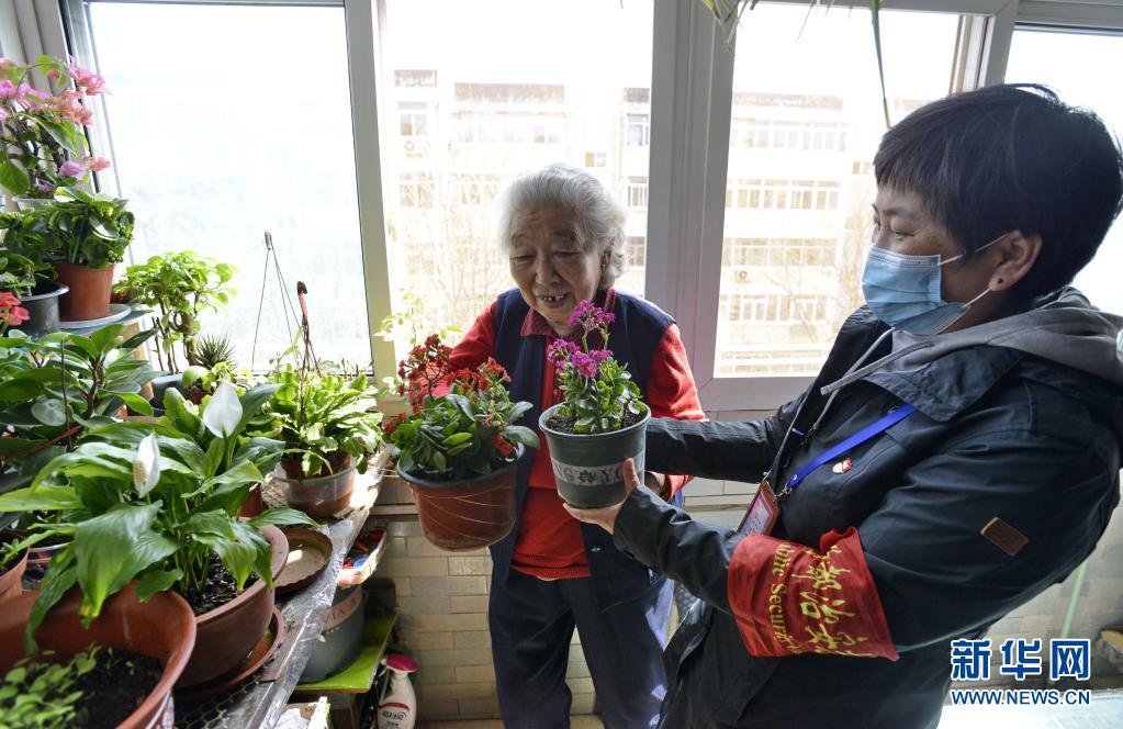 北京市豐臺區(qū)東高地街道黨員志愿者馮春紅(右)上門看望社區(qū)內高齡老人王康鳳,了解老人居家生活情況(2020年4月1日攝)。新華社記者 李欣 攝
