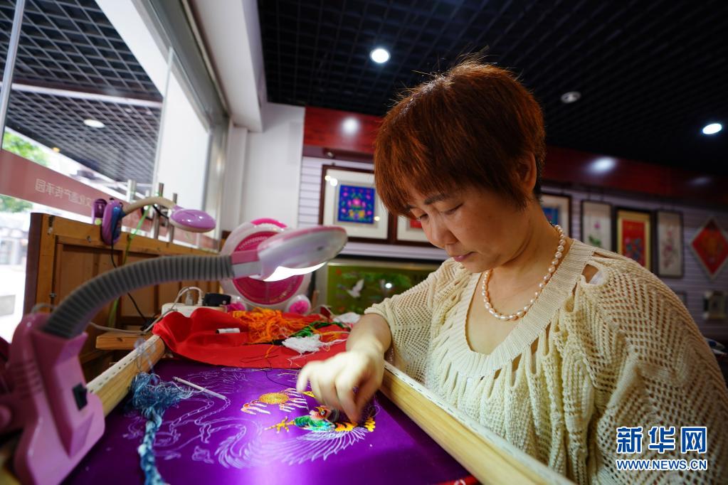 武漢市漢陽區(qū)江欣苑社區(qū)居民在進行非遺刺繡創(chuàng)作(7月18日攝)。新華社記者 邢廣利 攝