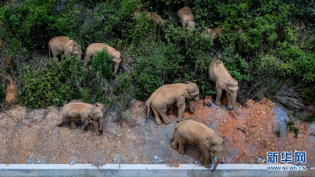 這是5月28日在云南省玉溪市峨山縣境內(nèi)拍攝的象群(無人機(jī)照片)。新華社記者 胡超 攝