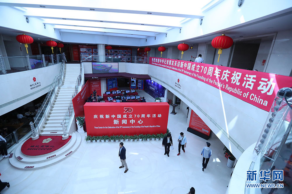 9月24日,慶祝中華人民共和國(guó)成立70周年活動(dòng)新聞中心在北京梅地亞中心二層新聞發(fā)布廳舉辦第一場(chǎng)新聞發(fā)布會(huì)。圖為新聞中心現(xiàn)場(chǎng)。新華網(wǎng) 雷東瑞 攝