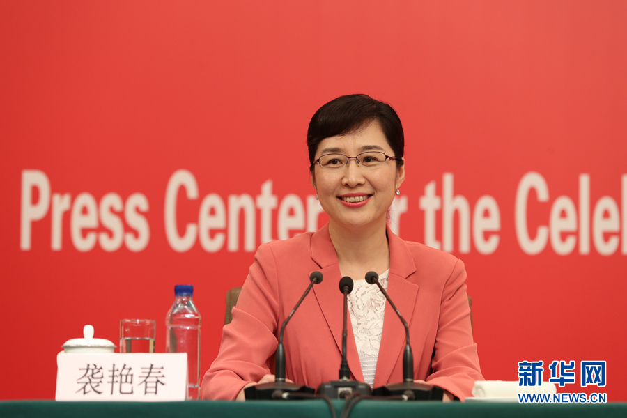 9月24日,慶祝中華人民共和國成立70周年活動(dòng)新聞中心在北京梅地亞中心二層新聞發(fā)布廳舉辦第一場專題集體采訪。圖為慶祝中華人民共和國成立70周年活動(dòng)新聞中心負(fù)責(zé)人襲艷春。新華網(wǎng)記者 郭小天 攝