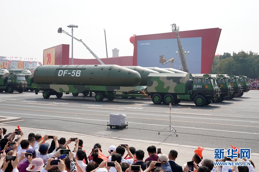 10月1日上午,慶祝中華人民共和國(guó)成立70周年大會(huì)在北京天安門(mén)廣場(chǎng)隆重舉行。這是東風(fēng)-5B核導(dǎo)彈方隊(duì)。 新華社記者 楊世堯 攝