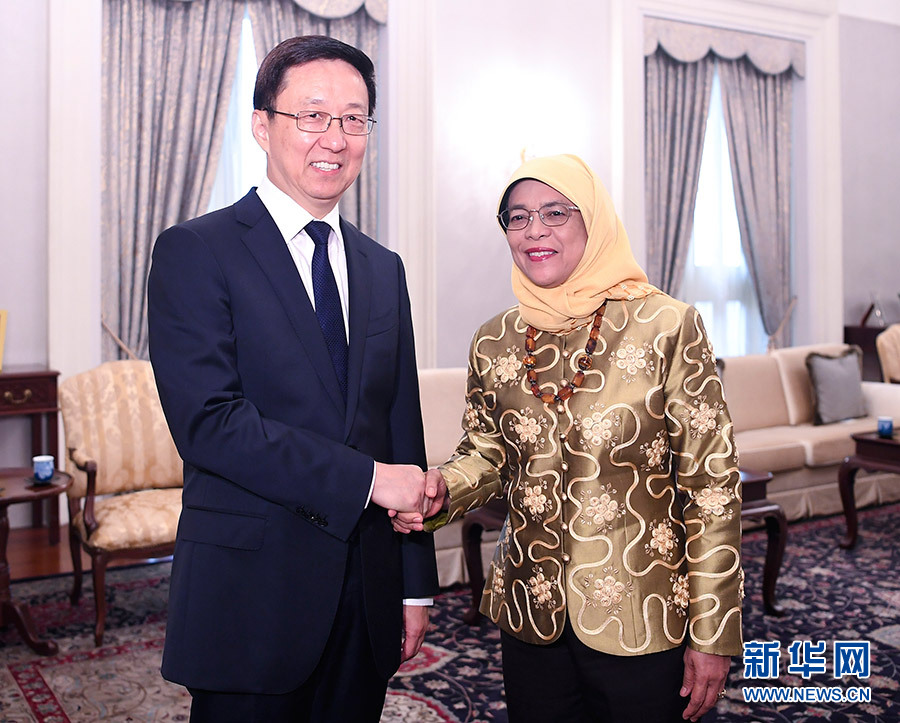 在同新方領(lǐng)導(dǎo)人會見時,韓正轉(zhuǎn)達了習(xí)近平主席、李克強總理對哈莉瑪總統(tǒng)、李顯龍總理的親切問候,哈莉瑪和李顯龍表示感謝并請韓正轉(zhuǎn)達他們對中國領(lǐng)導(dǎo)人的良好祝愿。