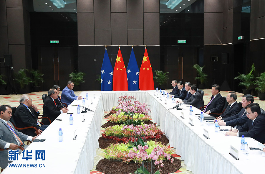 11月16日,國家主席習近平在莫爾茲比港分別會見建交太平洋島國領導人。這是習近平會見密克羅尼西亞聯(lián)邦總統(tǒng)克里斯琴。 新華社記者 謝環(huán)馳 攝